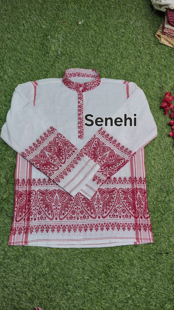 Assamese Gamusa Shirt, Traditional Gamusa Shirt, Assamese Traditional Shirt, Gamusa Design Shirt, Assamese Ethnic Wear, Bihu Special Shirt, Assamese Cultural Dress, Traditional Assamese Clothing, Gamusa Pattern Shirt, Ethnic Wear for Men Assam, Assamese Festival Wear, Cotton Gamusa Shirt, Assamese Handloom Shirt, Traditional White Red Shirt Assam